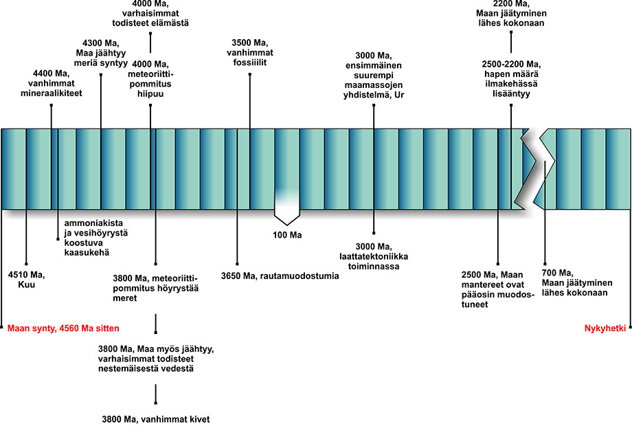 Maan historia yltää lähes viiden miljardin vuoden taakse. Tämän ajanjakson mahduttaminen kahteen kappaleeseen on rehellisesti sanottuna mahdotonta. Alle olen kuitenkin koonnut muutaman tärkeän tapahtuman planeettamme historiasta ja toiminnasta. Ne antavat hieman taustatietoa kivikierroksen kohteille. Suosittelen lämpimästi tutustumaan aiheeseen laajemmalti – etenkin jos alla oleva ja vahvasti tiivistetty versio jättää liian monta kysymystä avoimeksi.