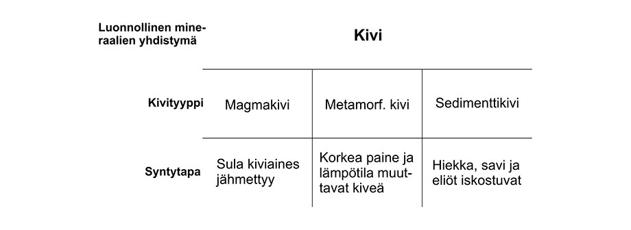 Useimmat kivet ovat koostumukseltaan heterogeenisiä eli ne sisältävät vaihtelevan määrän eri mineraaleja. Yleisesti voidaankin sanoa, että ”kivi on luonnollisten prosessien tuloksena syntynyt mineraalien yhdistelmä”. Tällainen yhdistelmä on voinut syntyä kolmella eri tavalla. Sedimenttikivi on syntynyt kerrostumalla, magmakivi sulasta kiviaineksesta kiteytymällä ja metamorfinen kivi alkuperäisen kiven muuntuessa korkean paineen ja lämmön vaikutuksesta. Siinä missä sedimentti voi kerrostua matalaan merenlahteen, vaatii metamorfoosi usein vuorijonon muodostumisen sillä vasta tällöin saavutetaan olosuhteet, joissa kiven fysikaaliset ja kemialliset ominaisuudet voivat muuttua. Sulaa kiveä taas syntyy lämpötilan kohotessa riittävästi. Tällaiset olosuhteet vallitsevat esimerkiksi tulivuoren sisässä.