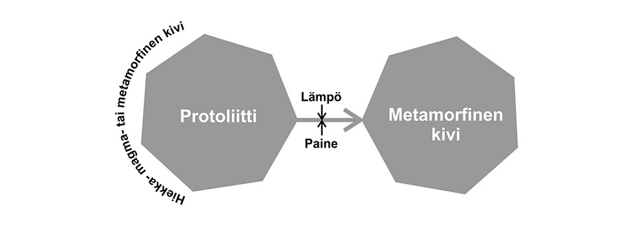 Kun lämpötila- ja paineolosuhteet kasvavat riittävän korkeiksi, niin kivet metamorfoituvat. Joissain tapauksissa myös fluidit, kuten hiilidioksidi, vaikuttavat prosessiin. Metamorfoosissa kivi ei sula, vaan se kiteytyy uudelleen. Uudelleenkiteytymisessä protoliitin (lähdekivi) kemiallinen koostumus ja fyysinen rakenne muuttuvat. Suomesta löytyviä metamorfisia kiviä ovat muun muassa Lapista louhittava marmori Kivikukkaron seinässä (kohde 14) sekä kvartsiitti Mehiläisen seinässä (kohde 5).