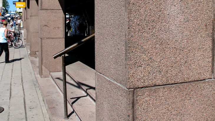 Nordean pylväässä käytettyä punaista graniittia kutsutaan kiviteollisuudessa nimellä Balmoral Red ja sitä on louhittu Taivassalosta 1960-luvulta lähtien. Taivassalon rapakivi eroaa esimerkiksi Vehmaalta louhittavasta siinä, että se on karkearakeisempaa. Hyvän säänkestävyyden ja kulutuskestävyyden myötä sitä on käytetty erittäin monipuolisesti ympäri maapalloa niin sisä- kuin ulkotiloissakin. Esimerkiksi Helsingin graniittitalo on verhoiltu Balmoral redillä. Pohjoismaisia esimerkkejä kiven käytöstä ovat vaikka Tukholman Cityterminalen sekä rautatieaseman aukio Oslossa. Kiven voimakas punaisuus korostuu karkean pintakäsittelyn myötä, mutta siitä voi kuitenkin läheltä tarkasteltuna erottaa tyypilliset mineraalit, joita ovat kalimaasälpä, kvartsi, plagioklaasi, biotiitti (tummat mineraalit) ja muskoviitti.